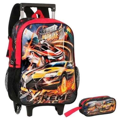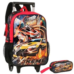 Kit Mochila Mochilete Infantil Carro Fast Machine Escolar Reforçada 2 em 1 Com Alças e Rodinhas Tamanho Grande Com Estojo