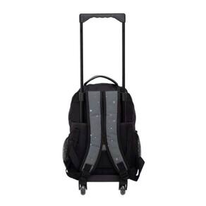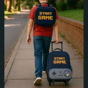 1 Bolso Principal, 1 frontal e 2 Laterais para garrafinhas; Mochila de carrinho com com alças de costas; Zíper com puxador personalizado em formato de controle de vídeo-game;