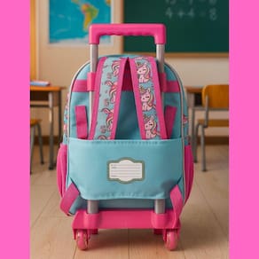 A mochila possui rodinhas em gel rígido, resistente e durável, fecho a zíper com puxadores Cada kit é composto por uma mochila, um estojo e uma lancheira com a mesma estampa da mochila.