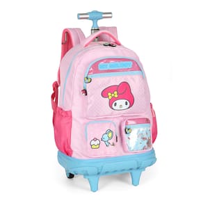Mochila com Rodinhas 18” Medidas: 46 cm (altura) x 34 cm (largura) x 22 cm (profundidade) Fabricada em material de náilon resistente, a mochila possui excelente acabamento e amplo espaço interno, perfeita para livros, cadernos e materiais escolares. Conta com carrinho reforçado, 2 rodas grandes que facilitam o transporte, pés de apoio firmes e alça retrátil ergonômica. As alças acolchoadas e ajustáveis permitem também o uso nas costas. Possui bolsos frontais funcionais, zíper trator de alta durabilidade e puxadores personalizados. O destaque fica por conta do logo emborrachado e das estampas exclusivas de cada personagem: • My Melody: combina tons de rosa e azul, com bolso frontal decorado com confete e a personagem em destaque. • Cinnamoroll: traz o adorável cachorrinho Sanrio em tons suaves de azul e rosa, com bolsos frontais ilustrados e estilo delicado.