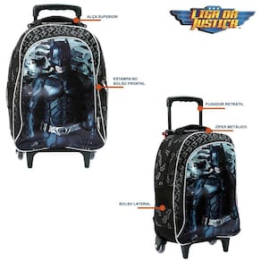 Kit Mochila Escolar Infantil DC Batman Liga da Justiça Com Rodinhas, acompanha lancheira e estojo. Agora você pode levar sua mochila do Batman no seu dia a dia ou acompanhar você na escola. Possui alça de mão reforçada. Sua abertura maior se dá por zíper com puxador. Na parte de dentro possui amplo espaço para a guardar diversos materiais como cadernos, livros e estojos. Na parte da frente, possui bolso com zíper para a guardar pertences de menor tamanho, e bolsos laterais. Características: Especificações: - Alça superior - Estampa no bolso frontal - Puxador retrátil- Zíper metálico- Bolso Lateral Medidas Lancheira: - Altura: 22cm- Largura: 22cm Medidas Estojo: - Altura: 10cm- Largura: 23cm Medidas Mochila: - Altura: 41cm- Largura: 15cm- Comprimento: 31cm Dúvidas Frequentes:1. A mochila possui rodinhas em siliconeR. Sim, ela possui rodinhas em silicone transparente. 2. Ela possui alça retrátilR. Sim, ela possui alça retrátil para ocupar menos espaço. 3. Ela possui quantas divisõesR. Ela possui 02 divisões para guardar suas coisas. 4. Qual o material da mochilaR. Ela é feita em poliéster e plástico. Tags:Mochila, escola, escolar, meninas, meninos, infantil, rodinha, material, personagem, batman, dc, herói, liga da justiça, batcaverna, batmovel, ghotam. Marca: Toys 2U