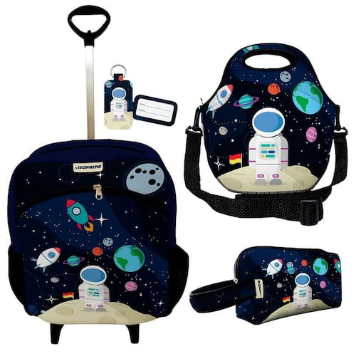 Nosso kit escolar contém lancheira, mochila com carrinho fixo e necessaire plus. São fabricados em Neoprene, material ível, leve e fácil de limpar.