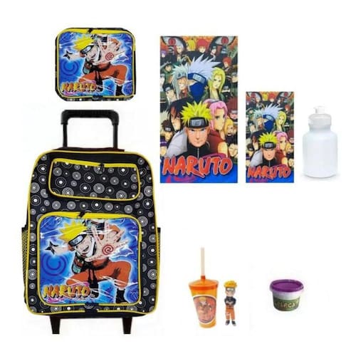 Kit Mochila Escolar Naruto Lancheira Bandana com 7 Itens Mochila infantil de 1º linha de alta resistência. O melhor preço do mercado. Este kit Contém: 1- Mochila do Naruto com Rodinha G 2- Lancheira com alça 3- Squeeze 4- Copinho + Boneco do Naruto 5- Toalha de Mão 6- Slime 7- Toalha de Banho Características mochila: Material: Nylon 600 1 compartimento com 2 Bolsos frontais Compartimento nas laterais para garrafas Alças reforçadas; Alça superior de mão; Bolsos laterais porta cantil; Alças ajustáveis; Rodas de silicone e apoio frontal; Carrinho embutido;