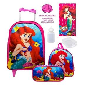 Kit mochila feminina infantil rodinhas pequena sereia lancheira e estojo Mochila de rodinhas infantil feminina pequena sereia com lancheira térmica e estojo combinando na mesma estampa ideal para escola ou viagem. Mochila exclusiva para quem procura qualidade, estilo, modernidade e praticidade. Possui um ótimo espaço já que contém dois compartimentos com zíper e dois bolsos externos laterais. Suficiente para carregar livros, cadernos, agenda e estojo. Vem junto lancheira térmica que encaixa no carrinho de mão e conserva temperatura de alimentos e bebidas. Ideal para uso escolar ou viagem. Estampa atual, versátil e indispensável no dia-a-dia.
