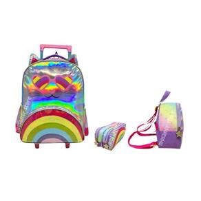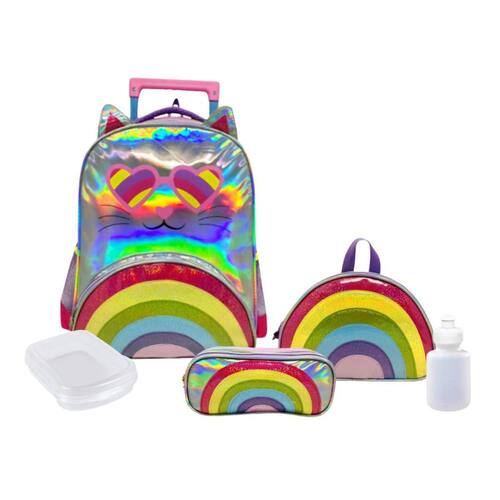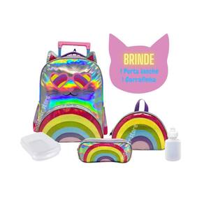 Kit mochila feminino rodinhas gato colorido lancheira estojo Mochila de rodinhas infantil feminina gatinha colorido com lancheira térmica e estojo combinando na mesma estampa ideal para escola ou viagem. Mochila exclusiva para quem procura qualidade, estilo, modernidade e praticidade. Possui um ótimo espaço já que contém um compartimento grande com zíper e dois bolsos externos laterais. Suficiente para carregar livros, cadernos, agenda e estojo. Vem junto lancheira térmica que encaixa no carrinho de mão e conserva temperatura de alimentos e bebidas. Ideal para uso escolar ou viagem.
