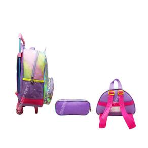 Especificações mochila: - mochila com as seguintes medidas aproximadas 41,5cm x 30cm x 13cm a x l x p . - capacidade de 18 litros. - carrinho de mão com a altura máxima aproximada de 82cm. - material em poliéster e poliuretano. - estampa colorida por toda mochila. - bolso frontal com glitter. - identificador no verso da mochila. - 2 compartimentos externo bolso , ideal para garrafa de água ou objetos pequenos. - 2 compartimentos com zíper. - puxadores personalizados. - alça de mão. - amplo espaço interno.