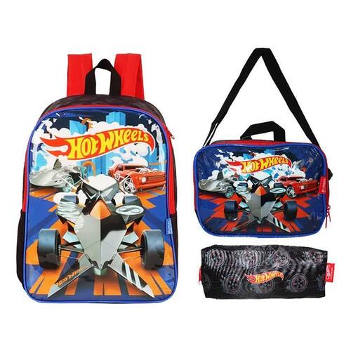 Contém: 01 un - Mochila Costas Hot Wheels. 01 un - Estojo Escolar Hot Wheels.