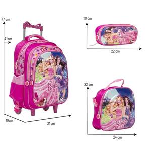 Kit Mochila Escolar Infantil Barbie Rodinhas, acompanha lancheira e estojo. Possui alça de mão reforçada. Agora você pode levar sua mochila no seu dia a dia ou acompanhar você na escola. Sua abertura maior se dá por zíper com puxador. Na parte de dentro possui amplo espaço para a guardar diversos materiais como cadernos, livros e estojos. Na parte da frente, possui bolso com zíper para a guardar pertences de menor tamanho e bolsos laterais.