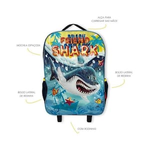 Kit Mochila Infantil Escolar com 03 Peças Tubarão Amarelo Kit Mochila Infantil Escolar com 03 Peças Tubarão Amarelo ===================================== Vem com uma mochila de rodinhas com compartimento principal espaçoso ideal para acomodar os livros, cadernos e materiais escolares no geral e mais dois bolsos laterais de redinha para garrafas.