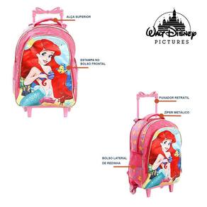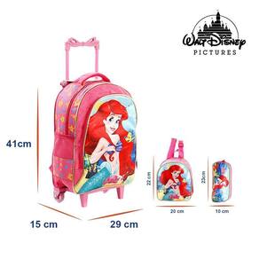 Kit Mochila Infantil Escolar Pequena Sereia Ariel com Rodinha. Agora você pode levar sua mochila Da Ariel no seu dia a dia ou acompanhar você na escola. Possui alça de mão reforçada. Sua abertura maior se dá por zíper com puxador. Na parte de dentro possui amplo espaço para a guardar diversos materiais como cadernos, livros e estojos. Possui bolso com zíper para a guardar pertences de menor tamanho, e bolsos laterais.Especificações: - Alça superior - Estampa no bolso frontal - Puxador retrátil- Zíper metálico- Bolso LateralMedidas Lancheira:- Altura: 22cm- Largura: 20cm Medidas Estojo:- Altura: 10cm- Comprimento: 23cm Medidas Mochila: - Altura: 41cm- Largura: 15cm- Comprimento: 29cmDúvidas Frequentes:1. A mochila possui rodinhas em siliconeR. Sim, ela possui rodinhas em silicone transparente. 2. Ela possui alça retrátilR. Sim, ela possui alça retrátil para ocupar menos espaço. 3. Ela possui quantas divisõesR. Ela possui 02 divisões para guardar suas coisas. 4. Qual o material da mochilaR. Ela é feita em poliéster e plástico. Tags:Mochila, escola, escolar, meninos, meninas, infantil, rodinha, material, personagem, sereia, pequena sereia, ariel, mar, disney, princesas. Marca: Toys 2U