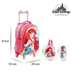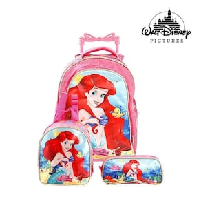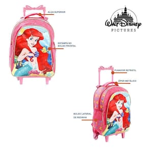 Kit Mochila Infantil Escolar Pequena Sereia Ariel com Rodinha. Agora você pode levar sua mochila Da Ariel no seu dia a dia ou acompanhar você na escola. Possui alça de mão reforçada. Sua abertura maior se dá por zíper com puxador. Na parte de dentro possui amplo espaço para a guardar diversos materiais como cadernos, livros e estojos. Possui bolso com zíper para a guardar pertences de menor tamanho, e bolsos laterais.Especificações: - Alça superior - Estampa no bolso frontal - Puxador retrátil- Zíper metálico- Bolso LateralMedidas Lancheira:- Altura: 22cm- Largura: 20cm Medidas Estojo:- Altura: 10cm- Comprimento: 23cm Medidas Mochila: - Altura: 41cm- Largura: 15cm- Comprimento: 29cmDúvidas Frequentes:1. A mochila possui rodinhas em siliconeR. Sim, ela possui rodinhas em silicone transparente. 2. Ela possui alça retrátilR. Sim, ela possui alça retrátil para ocupar menos espaço. 3. Ela possui quantas divisõesR. Ela possui 02 divisões para guardar suas coisas. 4. Qual o material da mochilaR. Ela é feita em poliéster e plástico. Tags:Mochila, escola, escolar, meninos, meninas, infantil, rodinha, material, personagem, sereia, pequena sereia, ariel, mar, disney, princesas. Marca: Toys 2U