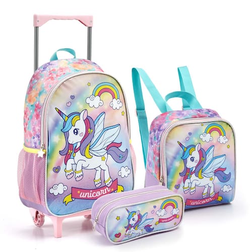 O kit escolar mochila Unicorn da Seanite, fabricada em Poliéster e PVC possui um bolso grande para acomodar os itens maiores, dois bolsos laterais para acomodar sua garrafinha de água e espaço com etiqueta para identificação do item. Além disso, o kit ainda conta com um estojo super espaçoso e uma lancheira com sistema de isolamento térmico para conservação do seus lanchinhos.