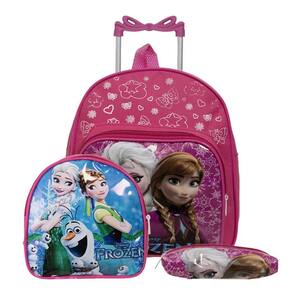 Kit Mochila Escolar Infantil Frozen Rodinhas, acompanha lancheira e estojo. Possui alça de mão reforçada. Agora você pode levar sua mochila no seu dia a dia ou acompanhar você na escola. Sua abertura maior se dá por zíper com puxador. Na parte de dentro possui amplo espaço para a guardar diversos materiais como cadernos, livros e estojos. Na parte da frente, possui bolso com zíper para a guardar pertences de menor tamanho e bolsos laterais.