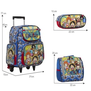 Kit Mochila Escolar Infantil One Piece Rodinhas, acompanha lancheira e estojo. Possui alça de mão reforçada. Agora você pode levar sua mochila no seu dia a dia ou acompanhar você na escola. Sua abertura maior se dá por zíper com puxador. Na parte de dentro possui amplo espaço para a guardar diversos materiais como cadernos, livros e estojos. Na parte da frente, possui bolso com zíper para a guardar pertences de menor tamanho e bolsos laterais.