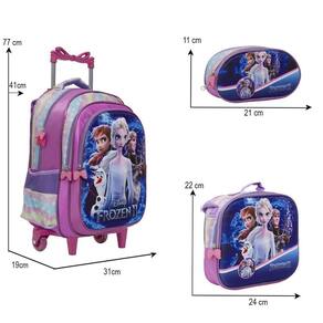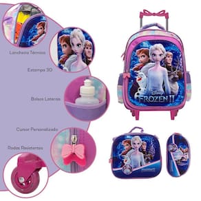 Kit Mochila Escolar Infantil Frozen Rodinhas, acompanha lancheira e estojo. Possui alça de mão reforçada. Agora você pode levar sua mochila no seu dia a dia ou acompanhar você na escola. Sua abertura maior se dá por zíper com puxador. Na parte de dentro possui amplo espaço para a guardar diversos materiais como cadernos, livros e estojos. Na parte da frente, possui bolso com zíper para a guardar pertences de menor tamanho e bolsos laterais.