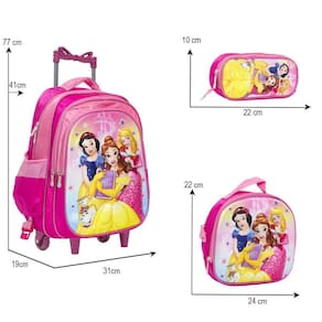 Kit Mochila Escolar Infantil Princesas Rodinhas, acompanha lancheira e estojo. Possui alça de mão reforçada. Agora você pode levar sua mochila no seu dia a dia ou acompanhar você na escola. Sua abertura maior se dá por zíper com puxador. Na parte de dentro possui amplo espaço para a guardar diversos materiais como cadernos, livros e estojos. Na parte da frente, possui bolso com zíper para a guardar pertences de menor tamanho e bolsos laterais.