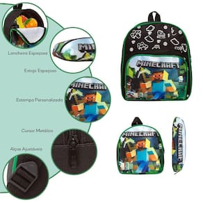 Kit Mochila Escolar Infantil Minecraft, acompanha lancheira e estojo. Possui alça de mão reforçada. Agora você pode levar sua mochila no seu dia a dia ou acompanhar você na escola. Sua abertura maior se dá por zíper com puxador. Na parte de dentro possui amplo espaço para a guardar diversos materiais como cadernos, livros e estojos. Na parte da frente, possui bolso com zíper para a guardar pertences de menor tamanho.