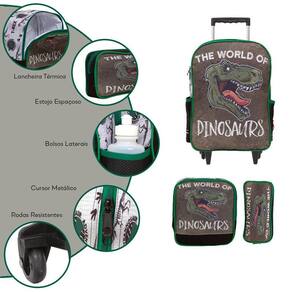 Kit Mochila Escolar Infantil Dinossauro Rodinhas, acompanha lancheira e estojo. Possui alça de mão reforçada. Agora você pode levar sua mochila no seu dia a dia ou acompanhar você na escola. Sua abertura maior se dá por zíper com puxador. Na parte de dentro possui amplo espaço para a guardar diversos materiais como cadernos, livros e estojos. Na parte da frente, possui bolso com zíper para a guardar pertences de menor tamanho e bolsos laterais.