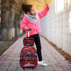 Kit Mochila Escolar Infantil Homem Aranha Rodinhas, acompanha lancheira e estojo. Possui alça de mão reforçada. Agora você pode levar sua mochila no seu dia a dia ou acompanhar você na escola. Sua abertura maior se dá por zíper com puxador. Na parte de dentro possui amplo espaço para a guardar diversos materiais como cadernos, livros e estojos. Na parte da frente, possui bolso com zíper para a guardar pertences de menor tamanho e bolsos laterais.