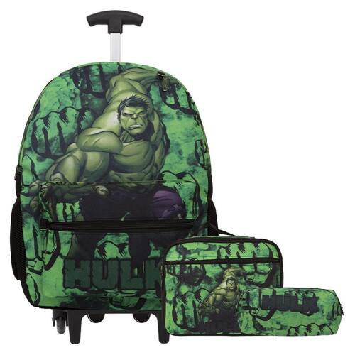 Kit Mochila Escolar Infantil Hulk Rodinhas, acompanha lancheira e estojo. Possui alça de mão reforçada. Agora você pode levar sua mochila no seu dia a dia ou acompanhar você na escola. Sua abertura maior se dá por zíper com puxador. Na parte de dentro possui amplo espaço para a guardar diversos materiais como cadernos, livros e estojos. Na parte da frente, possui bolso com zíper para a guardar pertences de menor tamanho e bolsos laterais.