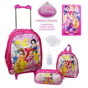 Kit mochila infantil rodinhas princesa + lancheira + estojo Mochila de rodinhas infantil feminina da princesas com lancheira térmica e estojo combinando na mesma estampa ideal para escola ou viagem. Mochila exclusiva para quem procura qualidade, estilo, modernidade e praticidade. Possui um ótimo espaço já que contém dois compartimentos com zíper e dois bolsos externos laterais. Suficiente para carregar livros, cadernos, agenda e estojo. Vem junto lancheira térmica que encaixa no carrinho de mão e conserva temperatura de alimentos e bebidas. Ideal para uso escolar ou viagem. Estampa atual, versátil e indispensável no dia-a-dia.