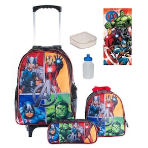 Kit mochila infantil rodinhas vingadores+ lancheira + estojo Mochila de rodinhas infantil masculina vingadores com lancheira térmica e estojo combinando na mesma estampa ideal para escola ou viagem.Mochila exclusiva para quem procura qualidade, estilo, modernidade e praticidade. Possui um ótimo espaço já que contém dois compartimentos com zíper e dois bolsos externos laterais. Suficiente para carregar livros, cadernos, agenda e estojo. Vem junto lancheira térmica que encaixa no carrinho de mão e conserva temperatura de alimentos e bebidas. Ideal para uso escolar ou viagem.Estampa atual, versátil e indispensável no dia-a-dia. Especificações mochila:- mochila com as seguintes medidas aproximadas 31cm x 42cm x 26cm.- carrinho de mão com a altura máxima aproximada de 82cm.- confeccionadas em material poliéster de ótima qualidade.- estampa colorida por toda mochila.- 2 compartimentos externos bolsos , ideal para garrafa de água ou objetos pequenos.- 2 compartimentos grandes com zíperes.- alça de mão.- alças ajustáveis e ergonômicas.- amplo espaço interno. Especificações da lancheira térmica:- lancheira térmica com as seguintes medidas 21cm x 23cm x 12cm.- confeccionadas em material sintético de qualidade.- estampa colorida por toda lancheira.- alça de mão.- alças ajustáveis.- amplo espaço interno. Especificações do estojo:- estojo com as seguintes medidas 23cm x 12cm x 6cm.- confeccionados em material sintético de qualidade.- estampa colorida por todo estojo.- amplo espaço interno para canetas, régua de até 15cm, lápis de cor, lapiseira e borracha. Observações:Enviamos junto com o kit,- 1 toalha de mão.- 1 garrafinha.- 1 porta lanche. Todos os produtos são conferidos para o envioProduto 100% novoProduto com garantia