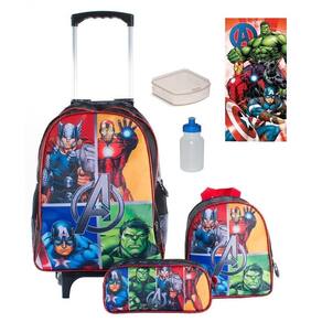 Kit mochila infantil rodinhas vingadores+ lancheira + estojo Mochila de rodinhas infantil masculina vingadores com lancheira térmica e estojo combinando na mesma estampa ideal para escola ou viagem. Mochila exclusiva para quem procura qualidade, estilo, modernidade e praticidade. Possui um ótimo espaço já que contém dois compartimentos com zíper e dois bolsos externos laterais. Suficiente para carregar livros, cadernos, agenda e estojo. Vem junto lancheira térmica que encaixa no carrinho de mão e conserva temperatura de alimentos e bebidas. Ideal para uso escolar ou viagem. Estampa atual, versátil e indispensável no dia-a-dia.