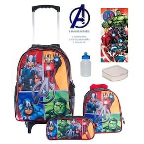 Mochila de rodinhas infantil masculina vingadores com lancheira térmica e estojo combinando na mesma estampa ideal para escola ou viagem.