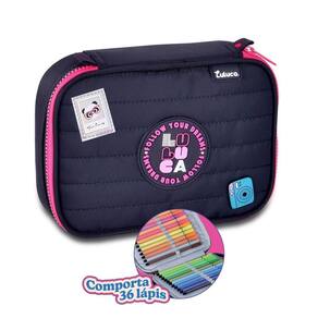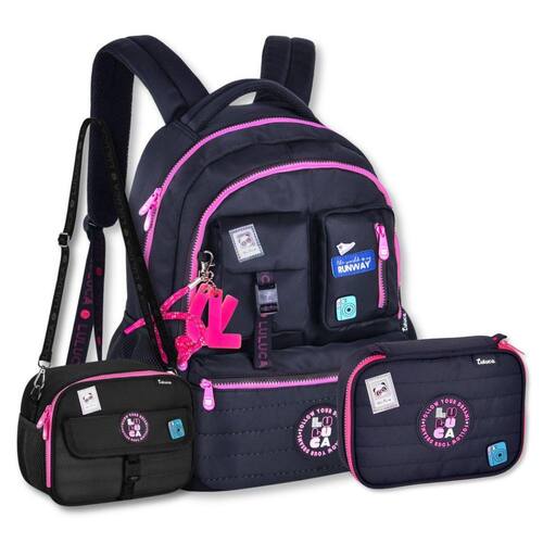 Mochila de Costas Luluca LU24636 + Lancheira Térmica LU24637 + Estojo Box LU24640 Este kit é muito mais que acessórios escolares: é uma combinação perfeita de estilo, conforto e organização Ela se destaca pelos detalhes modernos que encantam meninas e adolescentes que adoram estar na moda. A Mochila Luluca LU24636 é perfeita para quem busca estilo e funcionalidade no dia a dia Disponível em 3 cores incríveis e modernas - rosa, preta ou azul - esta mochila combina tendência e praticidade. Seu compartimento principal espaçoso, com área acolchoada para notebook e tablet, garante a segurança dos seus dispositivos. Além disso, conta com mais um compartimento maior com fechamento por zíper e divisórias, ideais para manter seus pertences bem organizados. Para quem precisa de ainda mais praticidade, a mochila oferece 3 bolsos frontais com design moderno, além de um bolso antifurto traseiro para itens importantes. As laterais possuem bolsos telados, perfeitos para garrafinhas ou acessórios. Seu conforto é garantido pelas opções de alças: alça de costas ajustável e acolchoada, alça superior de mão reforçada e alça carona, ideal para acoplar à mala em viagens. O toque final fica por conta do chaveiro exclusivo de corda e acrílico, que traz um charme único ao modelo. Dimensões aproximadas: 44x33x15 cm Lancheira Térmica LU24637 Praticidade e charme em uma peça. Essa lancheira térmica possui compartimento principal espaçoso, bolso frontal e bolso lateral telado. Com zíper bicolor, cadarços logados acetinados, pins de metal e etiqueta de borracha, ela é ideal para manter seus lanches sempre frescos. Dimensões aproximadas: 19x24x12 cm. Estojo Box LU24640 Compacto e funcional, ideal para organizar seus materiais escolares com eficiência. Possui: Espaço interno com elásticos para até 36 lápis, além de um estojo adicional com zíper. Dimensões aproximadas: 22x16x06 cm. Confeccionadas em nylon com matelassê, cadarços acetinados, alfinetes de metal, etiqueta de borracha e zíper bicolor.