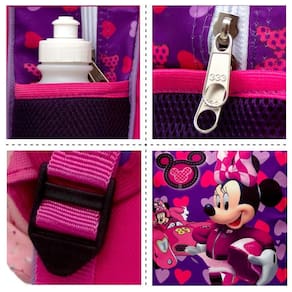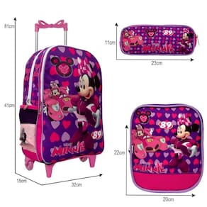 Kit Mochila Escolar Infantil Minnie Mouse Rodinhas, acompanha lancheira e estojo. Possui alça de mão reforçada. Agora você pode levar sua mochila no seu dia a dia ou acompanhar você na escola. Sua abertura maior se dá por zíper com puxador. Na parte de dentro possui amplo espaço para a guardar diversos materiais como cadernos, livros e estojos. Na parte da frente, possui bolso com zíper para a guardar pertences de menor tamanho e bolsos laterais.