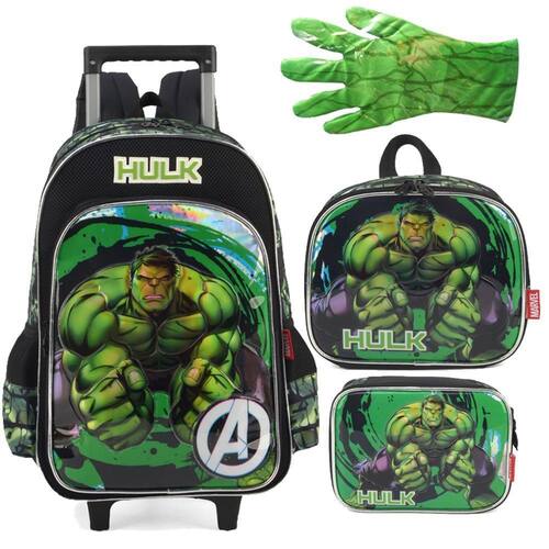 Contém: 01 un - mochila de rodinhas hulk - ref.: ic38106ag. 01 un - lancheira escolar infantil hulk avengers. 01 un - estojo box escolar infantil hulk avengers. 01 un - luva imitando a mão do hulk