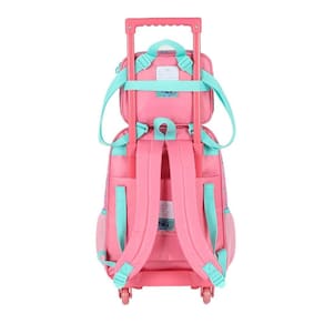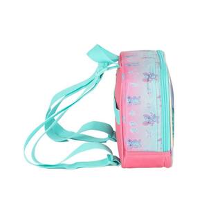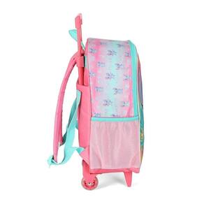 Kit mochila de rodinhas com bolsos laterias em tela com elástico, não possui alças de costas, silk frontal, alça de mão. Lancheira estampada com alça de costas e alça de mão, além de etiquetas personalizadas.