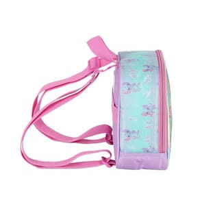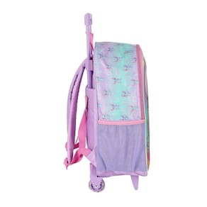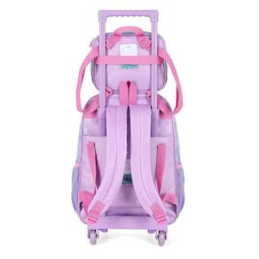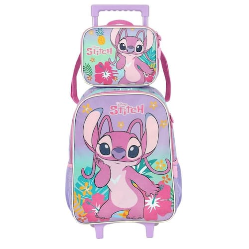 Kit mochila de rodinhas com bolsos laterias em tela com elástico, não possui alças de costas, silk frontal, alça de mão. Lancheira estampada com alça de costas e alça de mão, além de etiquetas personalizadas.