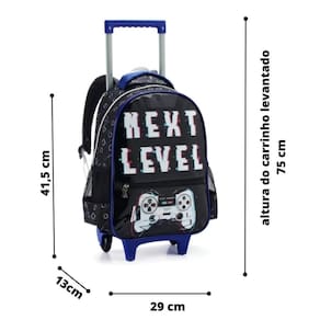 Características mochila de rodinhas; Ocasião: escolar, dia a dia, passeio Alça de mão Alça de mão acolchoada Alça de costas reforçada acolchoada Haste ajustável 2 rodinhas de silicone 1 compartimento 1 bolso frontal 2 bolsos laterais para garrafa Estampa personalizado joystick Etiqueta de identificação nas costas