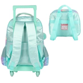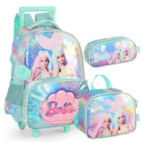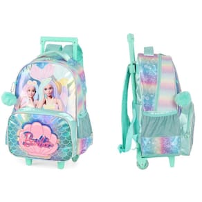 MOCHILA DE RODINHAS A mochila é confeccionada em cetim brilhoso, com a parte da frente em material holográfico e PVC estampado da BARBIE SEREIA, com detalhes em 3D, fechamento com zíper e puxadores personalizados - Possui um bolso grande principal, bolso frontal amplo, bolsos laterais para garrafas e pequenos pertences em telinha dupla metalizada, oferecendo bastante espaço para levar materiais para escola ou para passeios. - Acompanha etiqueta para colocar o nome da criança na parte traseira. - Possui alça de mão reforçada e alças de costas acolchoadas e reguláveis. - transporte Conveniente: As rodinhas e o puxador tornam o transporte fácil e divertido, mesmo para os pequenos. - licenciamento Oficial: Este produto é oficial, garantindo que você tenha um produto autêntico e de alta qualidade. - Tamanho aproximado com a haste abaixada: 43 x 32 x 15cm
