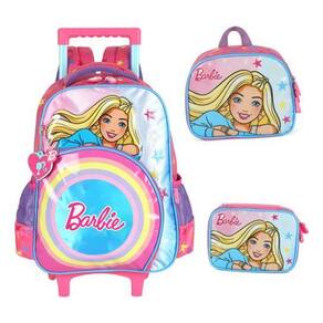 Descrição: Esse lindo kit escolar barbie vai fazer sucesso entre as meninas. Esse modelo conta com 1 compartimento principal e mais 1 frontal além de dois bolsos laterais para colocar a garrafa. Possui 2 rodinhas de silicone e 2 apoiadores frontais para mantê-la em pé. Sua haste metálica é retrátil. Informações mochila com rodinhas; Medidas: altura: 41cm x largura: 30cm x profundidade: 15cm Peso: 1,500kg Capacidade: 17l Estampa em pu Chaveiro personalizado Personagem em alto relevo modelo da cor azul Logo em alto relevo modelo da cor rosa Tecido texturizado modelo da cor rosa Altura da alça retrátil fechada: 45cm Altura da alça retrátil aberta: 73cm Informações lancheira térmica; Medidas: altura: 19cm x largura: 23cm x profundidade: 10cm Peso: 300gr Capacidade: 4,370l Material: 30% pvc 70% poliéster Obs: não acompanha garrafa/potinho Informações estojo; Medidas: altura: 15cm x largura: 21cm x profundidade: 6cm Peso: 100gr Material: 30% pvc 70% poliéster de 6 meses contra defeitos de fabricação. Dicas e cuidados; Proteja os objetos pontiagudos ou cortantes evitando o contato direto com o produto. Guarde o produto e um local seco, fresco e arejado, para evitar a proliferação de fungos que podem danificar o produto. Para limpeza, use apenas água morna e sabão neutro nas partes metálicas somente uma flanela seca. Nunca aplique produtos abrasivos, solventes ou quaisquer agentes químicos. Para secagem, utilize apenas pano seco. Não exponha ao sol e altas temperaturas por um período de tempo prolongado. Apare sempre os fios soltos do tecido, para que eles não se prendam no zíper. Duvida faça-nos uma pergunta : Marca: Não Informado