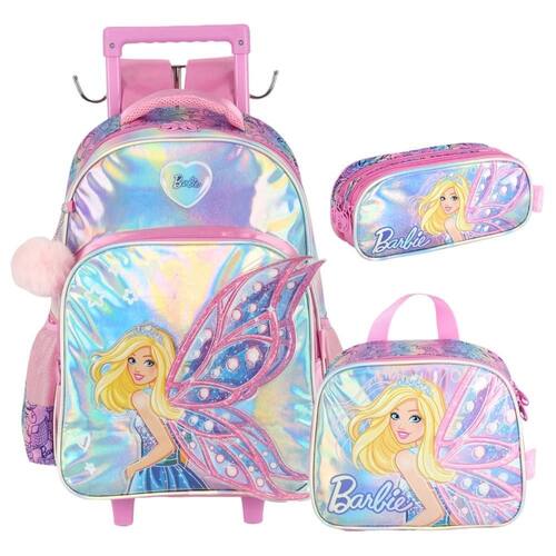 MOCHILA DE RODINHAS A mochila é confeccionada em cetim brilhoso, com a parte da frente em material holográfico e PVC estampado da BARBIE FADA, com detalhes em 3D, fechamento com zíper e puxadores personalizados - Possui um bolso grande principal, bolso frontal amplo, bolsos laterais para garrafas e pequenos pertences em telinha dupla metalizada, oferecendo bastante espaço para levar materiais para escola ou para passeios. - Acompanha etiqueta para colocar o nome da criança na parte traseira. - Possui alça de mão reforçada e alças de costas acolchoadas e reguláveis. - transporte Conveniente: As rodinhas e o puxador tornam o transporte fácil e divertido, mesmo para os pequenos. - licenciamento Oficial: Este produto é oficial, garantindo que você tenha um produto autêntico e de alta qualidade. - Tamanho aproximado com a haste abaixada: 43 x 32 x 15cm