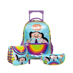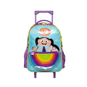 A mochila possui um compartimento amplo principal, onde é possível armazenar cadernos, livros e outros materiais escolares. Além disso, conta com um bolso frontal e um bolso lateral telados, perfeitos para organizar objetos menores. A mochila ainda possui um puxador personalizado, alça de costas e estampa arco-íris, que deixam o visual ainda mais encantador. As rodas de silicone com glitter garantem um deslocamento suave e divertido.