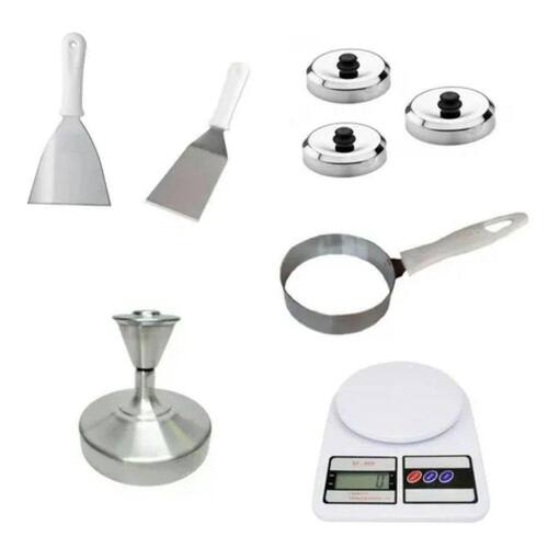 Kit Modelador De Hambúrguer 3 Abafador Espátula Ovos BalançaItens que acompanham kit:Acompanham:1- modelador hambúrguerMed. Aprox.: 12 cm diâmetro espessura = 2 cm3- abafador em alumínioMed. Aprox.: 14 cm diâmetro x 5,00 cm altura1- modelador ovosMaterial: aço inox, med. Aprox.: diâmetro: 10 cm, altura: 2 cm1- espátula curvaMed. Aprox.: 27 comprimento x 90 mm largura1- espátula retaMed. Aprox.: 25 comprimentos x 100 mm largura1- balança digital de alta precisãoPesa de 1 grama até 10 kg.