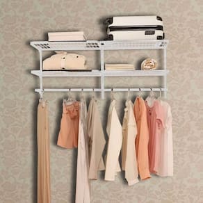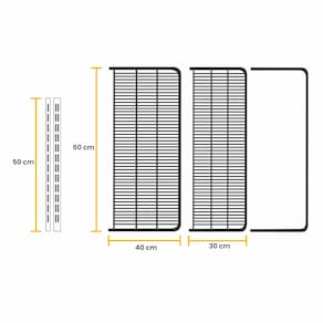 - 02 Trilhos Rasgo Simples de 50 cm. - 01 Trilho Rasgo Duplo de 50 cm. - 02 Prateleiras de 60 X 40 cm. - 02 Prateleiras de 60 X 30 cm. - 02 Cabideiros de 60 cm. - Buchas. - Parafusos.