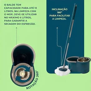 Sistema rotatório 360 para melhor limpeza e secagem do mop Balde com capacidade de 13 litros e cesto em aço inoxidável Acompanha 2 refis do esfregão Cabo ergonômico e ajustável para maior conforto durante o uso Ideal para pisos de madeira, porcelanato, cerâmica e laminados Praticidade e eficiência, sem necessidade de contato com a sujeira Mop com cabo de 120cm de comprimento