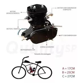 Kit Motor Bicicleta 80cc Completo Motorizada Gasolina Tanque O Kit Motor Tipo 80 Cilindradas 2 Tempos é refrigerado a ar e tem um consumo médio entre 30 a 45km por litro. Informações Técnicas: - Cor Motor: Prata ou Preto - Cor do Tanque: Preto ou Prata Atenção: As cores do motor e tanque podem variar e, será enviado de acordo com disponibilidade em : motor prata ou preto e tanque prata ou preto, não sendo possível escolher Dimensões Aproximadas do Motor: - Altura 26cm - Comprimento 25cm - Largura 13cm - Padrão do motor medida M8 padrão mecanico em mm - Modelo: Tipo 80CC 2T - Tipo de Motor: 2 Tempos - Cilindradas: 70cc reais - Potência: 3hp a 5000rpm em bancada - Motor: Monocilíndrico - Ignição: Eletrônica CDI - Embreagem: Seca ativada por alavanca - Refrigeração: Ar - Consumo: 30 a 45km por litro consumo varia nessa faixa conforme peso do condutor e regulagem de carburador - Autonomia: até 81km por tanque - Combustível: Gasolina / óleo 2 tempos sintético ou semissintético Período de amaciamento: primeiros 500km rodados ou 15 litros de combustível consumidos; - Mistura de óleo: no período de amaciamento misturar para 1 litro de combustível 60ml de óleo 2t por litro de gasolina, após o período de amaciamento misturar 30ml de óleo para 1 litro de gasolina - Velocidade de media: 25 a 30km/h - Velocidade máxima: 70km/h se muito bem acertado e regulado - Tanque: 1,8litros - Transmissão primária: por engrenagem - Secundaria: pinhão, corrente, coroa - Relação:pinhão: 10 dentes - Coroa: 44 dentes - Corrente: 1/2x415 - Peso: 9 kg - Vela ignição: grau 8 - Peso suportado: 150kg Conteúdo da Embalagem: - Tanque para 1,8 litros de gasolina - Corrente - Protetor de corrente do motor - Esticador de corrente - Kit fixação coroa - Coroa 44 dentes - Escapamento prateado ou Preto - Chave de vela - Vela de ignição - CDI - Torneira de gasolina - Mangueira de gasolina - Filtro de gasolina - Carburador - Acelerador - Cabo do acelerador - Cabo da embreagem - Manete da embreagem - Adaptador U para quadros com tubo grosso Atenção: - Instale com um profissional especializado Marca: Não Informado