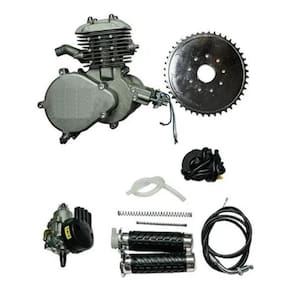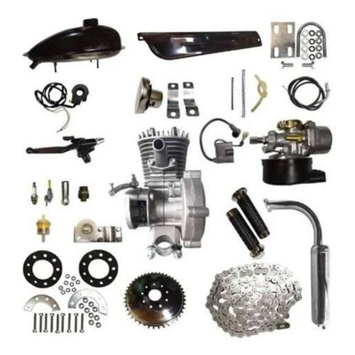 Kit Completo Motor Para Bicicleta Motorizada 80Cc Preto Motorize a sua bicicleta e usufrua de um excelente meio de locomoção. Transforme a sua ida ao trabalho, a praia, a padaria, a escola, a faculdade ou até mesmo entre bairros e avenidades, em uma atividade rica e prazerosa. Velocidade máxima registrada em torno de 50 km / hora. O consumo depende das condições de uso do produto, variando entre 35 e 50 km por litro. Este é um motor 2 tempos portanto uma mistura de gasolina e óleo é necessária. O kit motor é de fácil instalação para quem tem noções de mecânica, se não possuir esse conhecimento procure um profissional para instalação Coroa de 44 dentes. Taque de gasolina 2 litros + adesivos no tanque. Tanque cor preta É preciso medir na bike para saber se ela tem as medidas mínimas de 27cm de altura e 17cm de largura entre o quadro. Limite de peso 120kg Fabricação Acompanha manual de instalação em português Assistência técnica Marca: Não Informado
