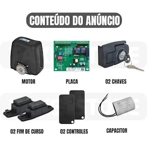 Conteúdo: 01 Motor de 1/5HP (220v . Não é bivolt) 01 Placa eletrônica NKXHB30 02 Chaves (falta de energia) 01 Capa protetora do motor 02 Imãs sensor hall (Fim de curso) 02 Controles com suporte 01 Capacitor 01 Manual de instalação