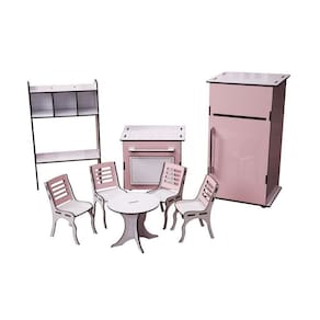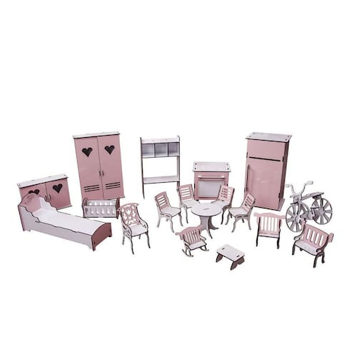 Confeccionado em mdf de 3 mm, o kit de móveis é composto pordiversas peças, as quais se encaixam sutilmente devido a precisão de corte dosmesmos. Não acompanha casinha.
