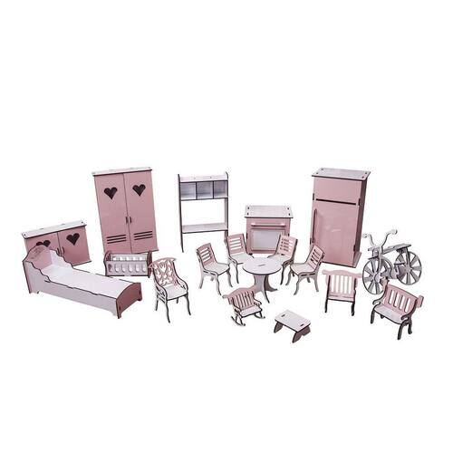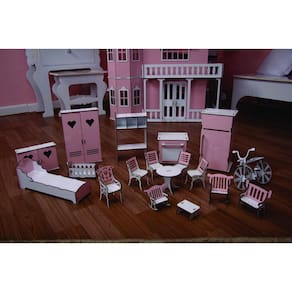 Confeccionado em mdf de 3 mm, o kit de móveis é composto pordiversas peças, as quais se encaixam sutilmente devido a precisão de corte dosmesmos. Não acompanha casinha.