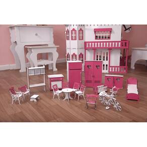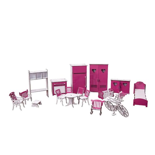 Confeccionado em mdf de 3 mm, o kit de móveis é composto pordiversas peças, as quais se encaixam sutilmente devido a precisão de corte dosmesmos. Não acompanha casinha.