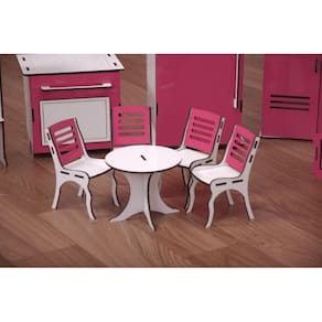 Confeccionado em mdf de 3 mm, o kit de móveis é composto pordiversas peças, as quais se encaixam sutilmente devido a precisão de corte dosmesmos. Não acompanha casinha.