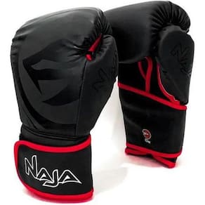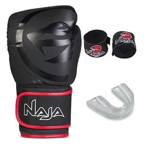 Kit Muay Thai Boxe Naja Luva Preta E Vermelha 12 Oz Conteúdo da embalagem: 01x par de luvas naja+ 01x protetor bucal transparente + 01x par de bandagem naja + 01x sacola para transporte da luva. O kit naja black line, possui revestimento em couro sintético e enchimento em n.T, que oferece precisão no molde para um encaixe perfeito. Estudos internacionais científicos resultam numa matéria-prima inovadora para o melhor enchimento da luva. O material além de tudo amortece o impacto e dá ao atleta segurança e conforto. A bandagem naja de 2,5 metros é confeccionada em 100% poliéster com fechamento em tiras aderentes. Possui ainda o protetor bucal naja projetado para proteção dos dentes, gengivas, lábios em caso de impactos excessivos.
