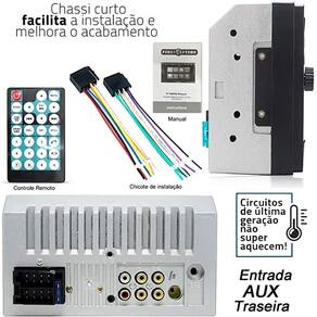 Idiomas: Chinês , Inglês , Russo , Espanhol e PortuguêsPainel com 7 cores de iluminação:(Azul, Azul Oceano, branco, amarelo, vermelho, roxo e verde)Equalizador Jazz, POP, Classic, RockCompatível com Android até versão 10 e IOS 14.6Reprodutor multimídia(áudio é Vídeo)Resolução de Imagem 800 x 480Visor com Data/Hora DigitalTela Full Touch 7 PolegadasEntrada SD CARD (Até 35 GB)Espelhamento Android e IOSEntrada Para Câmera de RéEntradas de áudio e vídeoSistema Resistivo Carplay e AndroidAuto via Cabo2 Saídas De Áudio e VídeoFormato de Música MP3Entrada Auxiliar P2Conexão bluetoothAgenda TelefônicaControle RemotoEntrada USBMP10 2 DinRádio FM
